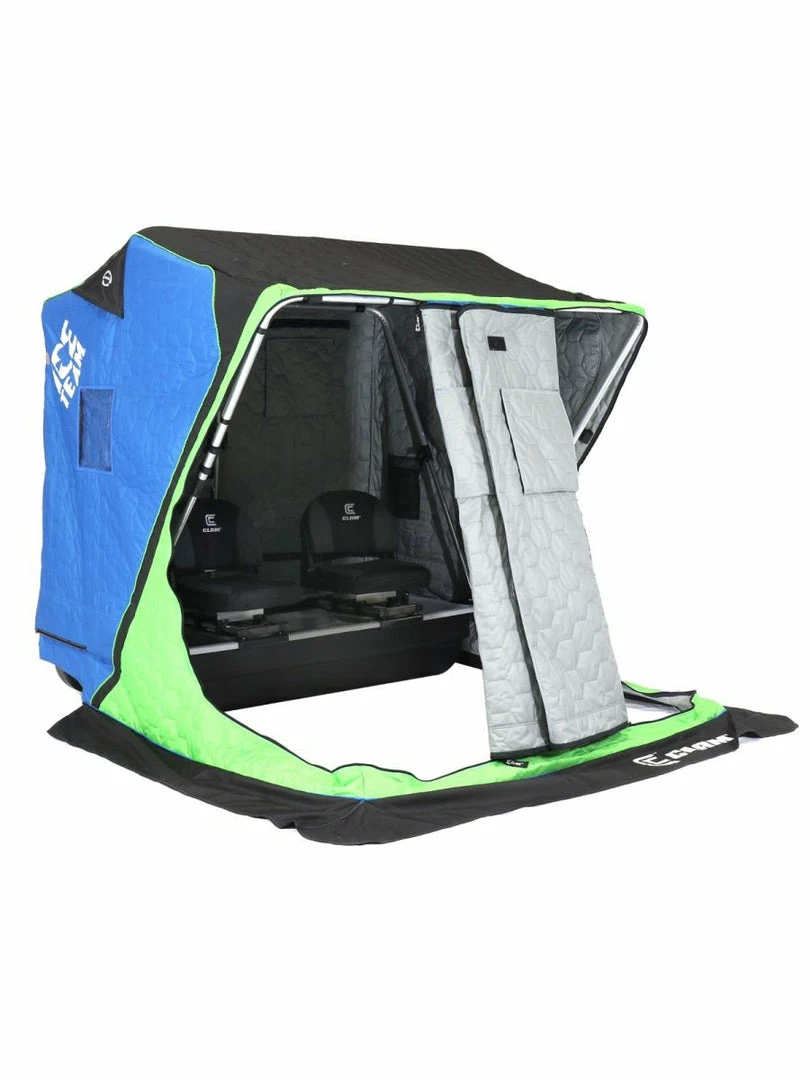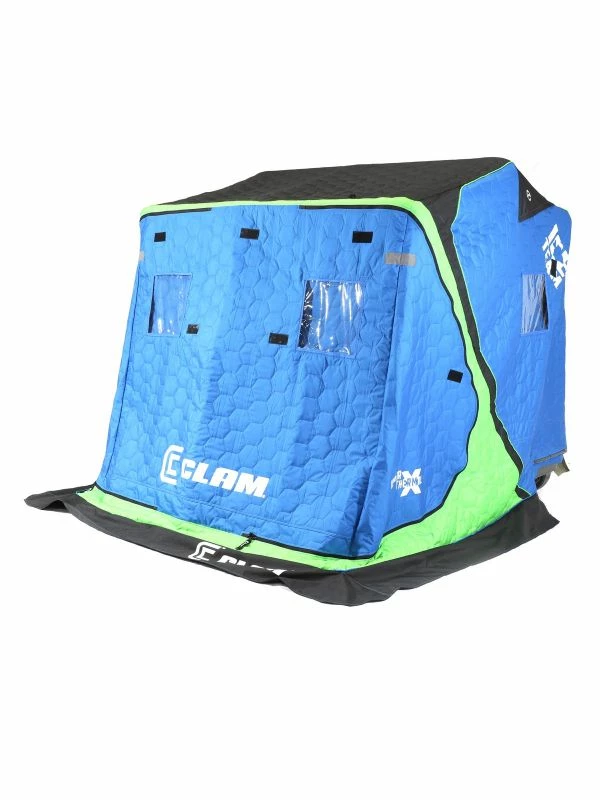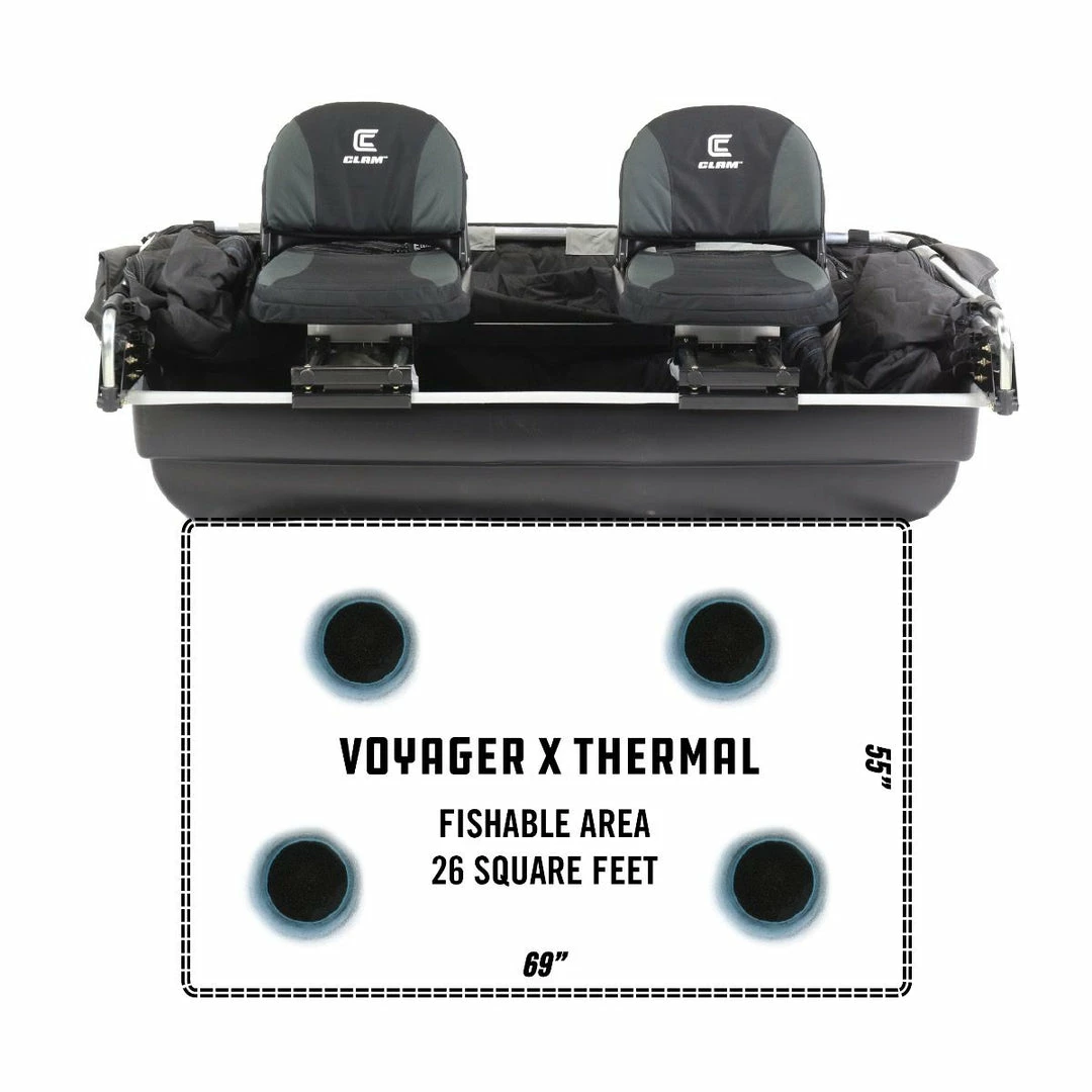 The Ice Team Edition Voyager flip-over shelter has been a huge hit the past couple of seasons with it’s awesome looks and features— and we have decided to come out with a Clam edition of the popular model! This Voyager X Thermal has all of the features of a durable flip-over fish house by Clam Outdoors, such as thermal fabric, extreme 1 1/4″ poles, RPSX clips, and side symmetry door system.