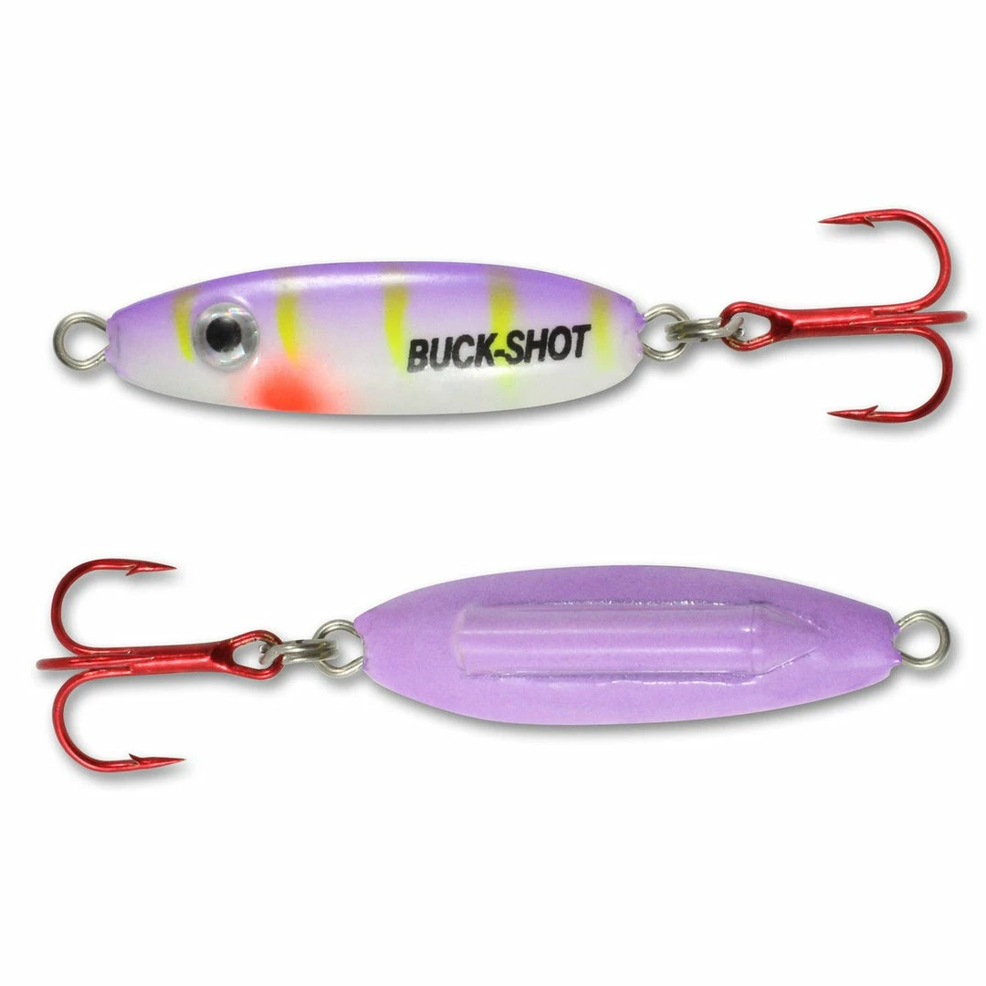The Buck-Shot® Rattle Spoon is deadly year-round for vertical jigging perch, walleye, trout, bass and pike. Jig aggressively in a lift-fall manner to call fish from a wide radius and make them strike. Tip with a minnow head, waxworms or IMPULSE Minnow Head and Perch Eye.