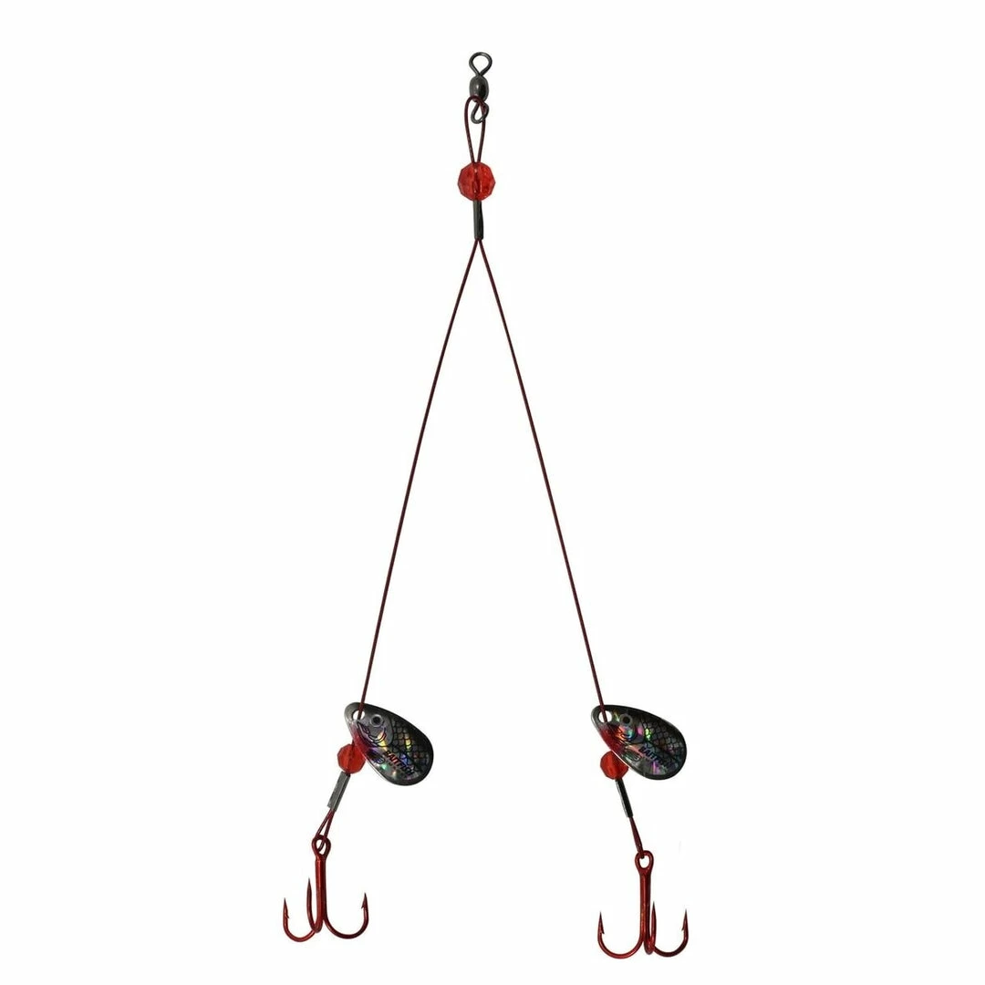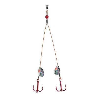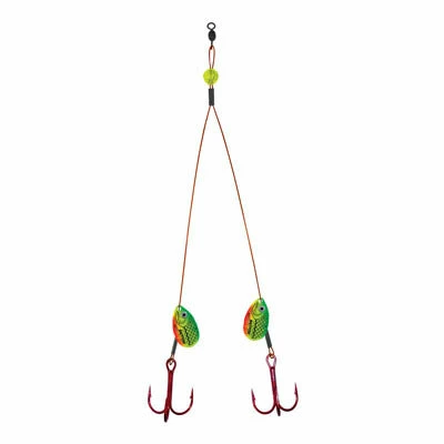 Fish below a tip-up or large float for trophy northern pike, walleyes, lake trout and muskies. Yoke-style design is ideal for live or dead bait. When rigging, position trebles so bait hangs horizontally. Set hook immediately when a fish takes the bait.