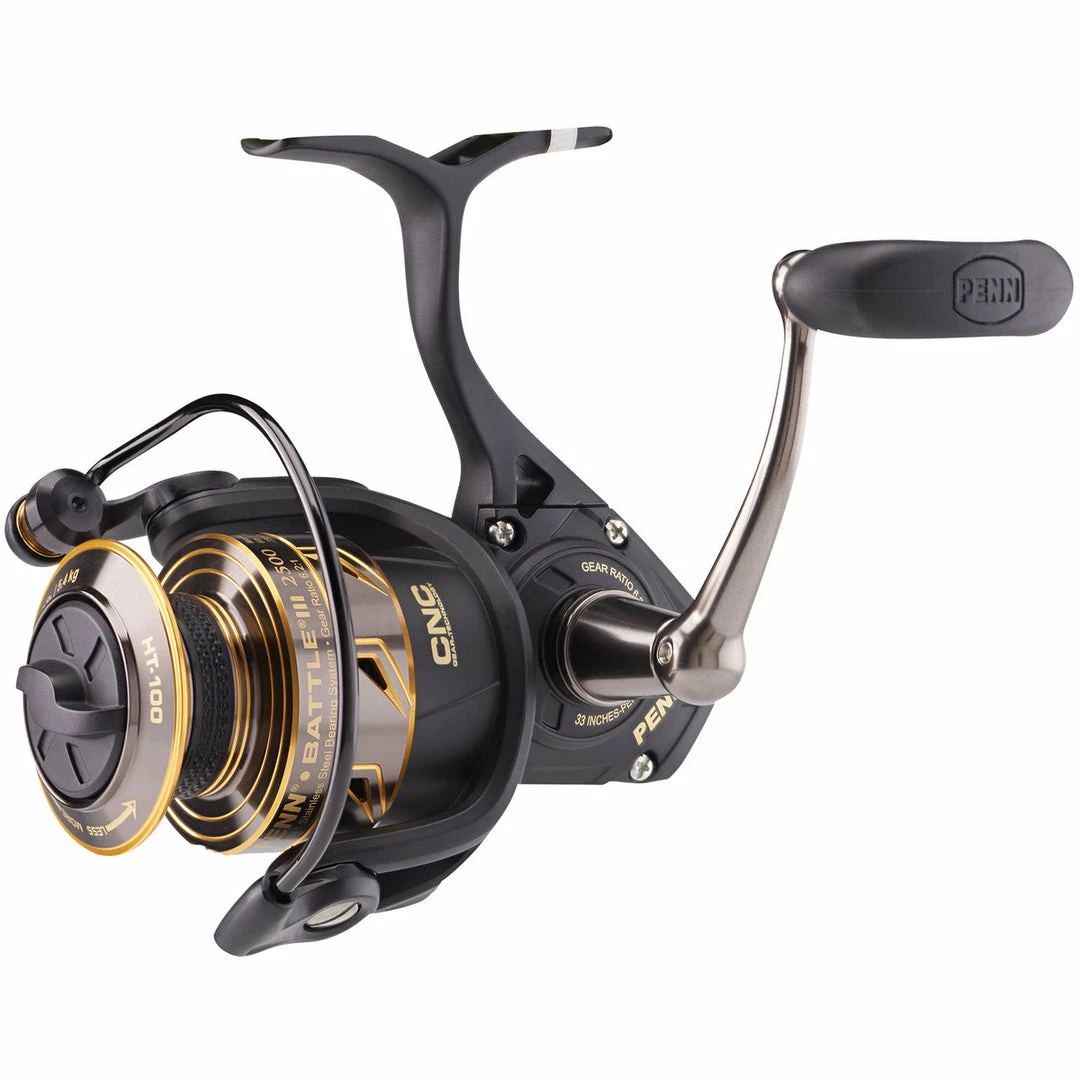 Penn Battle III DX Spinning Reels are built tough to withstand whatever the saltwater angler puts these reels through. The Battle III DX reels are more powerful than the previous Battle III spinning reels. Brass main gears are in every size along with an improved HT-100 drag system. Transfer more power through the gears to your big catch on the other end of the line with oversized EVA handle knobs.