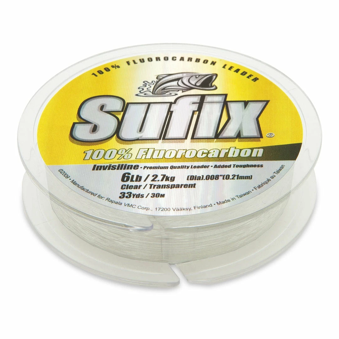 Sufix 100% Fluorocarbon Invisiline™Leaders has ultra-low visibility and superior strength and handling. Crystal clear 100% fluorocarbon leader that is virtually invisible in water. With incredible shock absorption high tensile and knot strength and superior abrasion resistance.